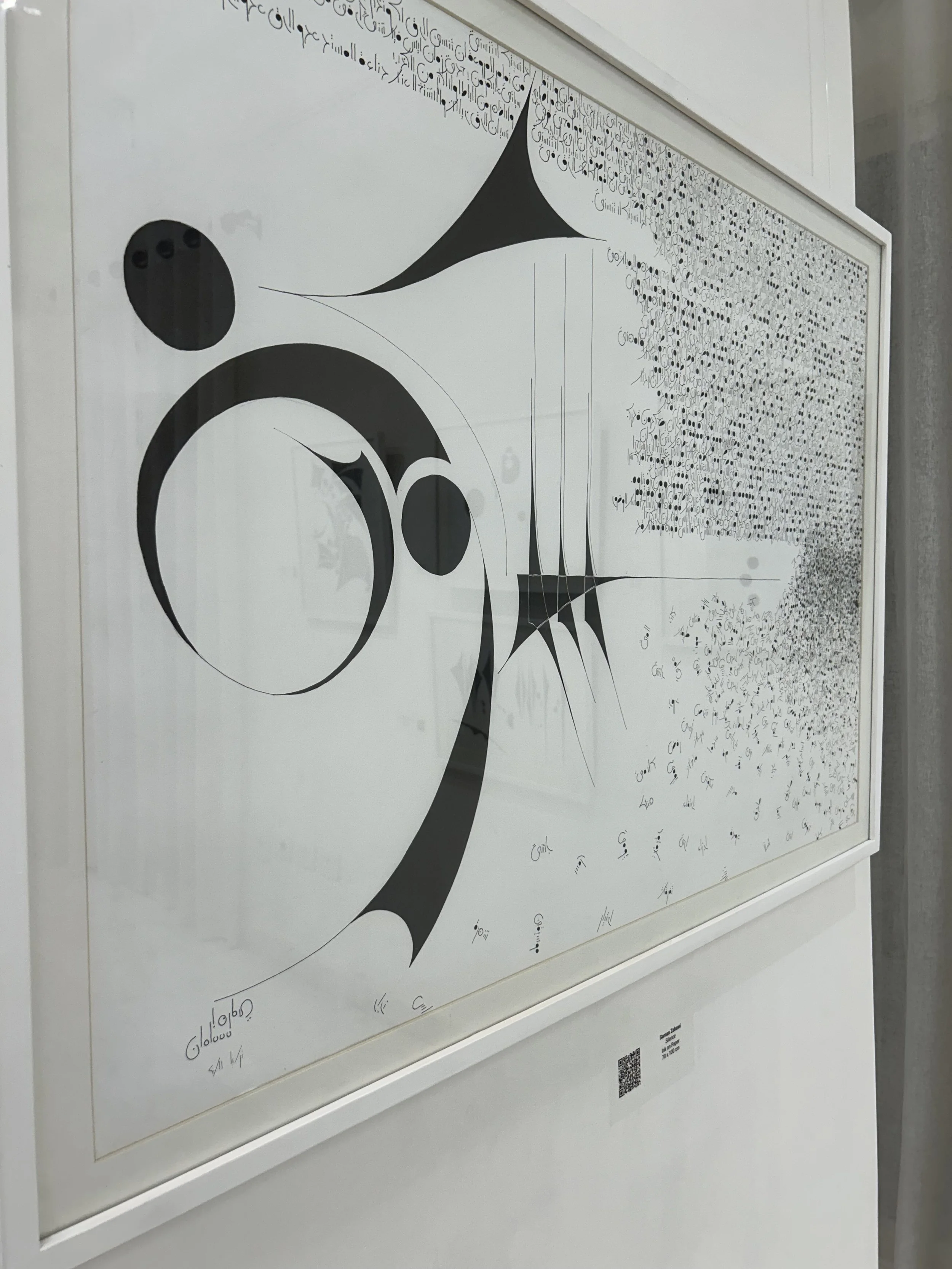 the power of this artwork lies in the silence that inhabits it. the word "sukoon" (stillness) is centered in the painting in exceptional shapes, and the letter "s" (seen) extends exaggeratedly, breaking the surrounding language.