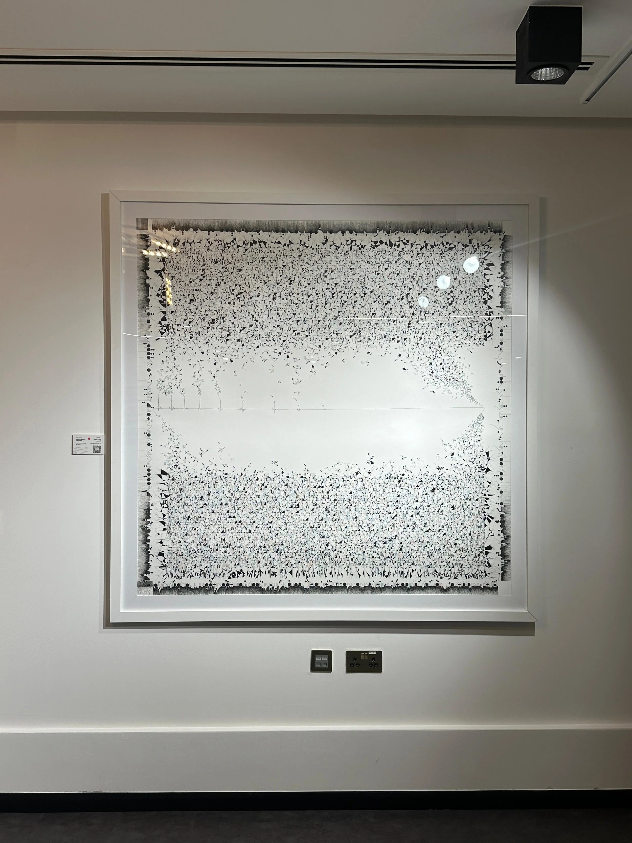 this large-scale artwork draws its inspiration from the tumultuous noise that fills our world today. a loud noise present at the top and bottom of the artwork, randomly and illegibly intermingled, embodying the chaos of sound surrounding us.